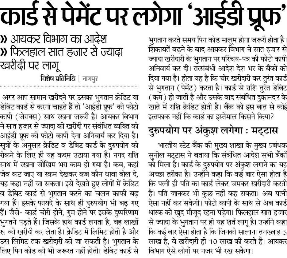 Published On : Wed, Oct 10th, 2012 By Nagpur Today कार्ड से पेमेंट पर लगेगा ‘आईडी प्रूफ – Dainik Bhaskar Advertisement Watch LIVE TV Shop@NAGPUR GET YOUR OWN WEBSITE FOR ₹9,999 Domain & Hosting FREE for 1 Year No Hidden Charges Advertisement Advertisement
