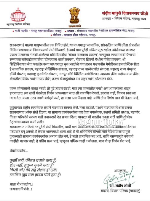 Nagpur: Senior Bharatiya Janata Party (BJP) leader and Member of the Maharashtra Legislative Council (MLC) Sandeep Joshi has formally announced his decision to retire from active politics, stating that the changing political culture and the need to make space for younger leadership compelled him to step aside.
