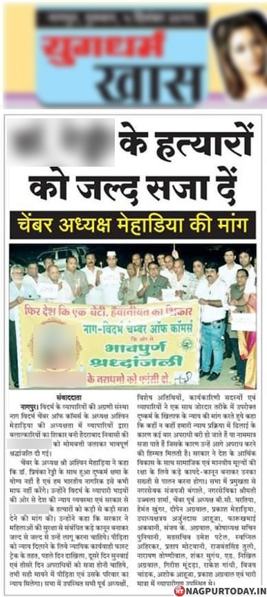 नागपुर: हैदराबाद में वेटरनरी डॉक्टर के साथ दुष्कर्म के साथ उसकी हत्या के विरोध में देशभर में प्रदर्शन हो रहे है। शहर में भी प्रदर्शन के दौरान सुप्रीम कोर्ट के निर्देशों का पालन नहीं किए जाने की तस्वीरें सामने आ रही है। प्रदर्शन में एक नामी संस्था के सदस्यों के साथ ही पूर्व मंत्री और विधायक की मौजूदगी में प्रदर्शन किया गया। लेकिन विरोध के बैनर के साथ ही उस बैनर पर मृतक पीड़िता की फोटो के साथ ही उसका नाम भी लिखा गया था। इसमें सबसे बड़ी बात यह है की जिन्हे सुप्रीम कोर्ट के दिशा-निर्देशों की जानकारी है, ऐसे समाचार पत्र ने भी अपनी न्यूज़ में जैसा का वैसा ही बैनर डालकर सीधे सीधे सुप्रीम कोर्ट के आदेश की ही अवेलहना की है। शहर में बुधवार 4 दिसंबर को विदर्भ के व्यापारियों की संस्था नाग विदर्भ चैम्बर ऑफ़ कॉमर्स के सदस्यों द्वारा यह प्रदर्शन किया गया था। इसमें मोमबत्ती जलाकर मृतक को श्रद्धांजलि दी गई और आरोपियों के लिए फांसी की मांग की गई थी। इस दौरान पूर्व मंत्री और मौजूदा विधायक भी प्रमुख रूप से मौजूद थे। प्रदर्शन में संस्था के शहर के नामी व्यापारियों समेत नगरसेवक भी मौजूद थे।