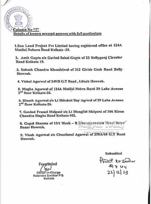 At Rabindra Sarobar Police Station on December 22, 2023, Kolkata Police lodged the FIR accusing Sunlands its promoter, of “fraudulent share transfer” of 1,510,000 shares, “forging and manipulating records,” and “illegally striking off” a loan of Rs 9,95,64,143 from Sunland Projects Pvt Ltd, through conspiring with multiple co-conspirators, including Vivek Agarwal and Vishal Agarwal, as per the FIR.