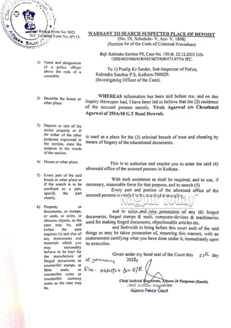 A few months later, Vivek, who is co-accused, has also had his home raided in Howrah’s GT Road, with Kolkata Police being instructed “to seize and take possession of any forged documents, forged stamps & seals, computer-devices” and to ensure that “every part and portion of the aforesaid office of the accused persons is needed to be searched thoroughly”. This is as per the official 18-page document issued by Alipore Police Court Chief Judicial Magistrate.