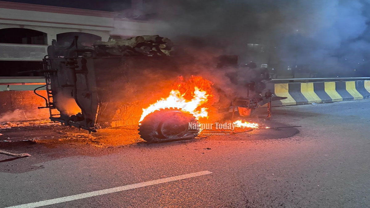 Nagpur: Panic erupted late at night after a bitumen heating vehicle suddenly caught fire on the flyover located in the wardhaman Nagar area of the city. Local residents, noticing thick smoke, promptly alerted the Fire Department. However, due to unclear initial information about the vehicle type and exact location, fire officials faced some confusion.