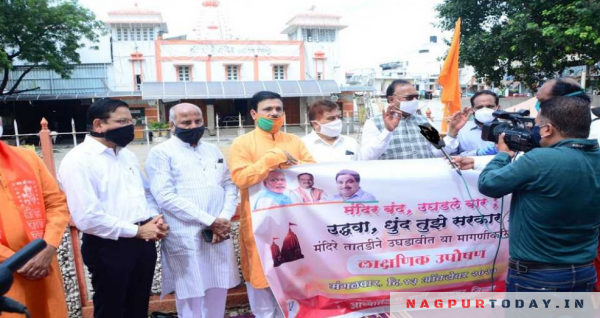 नागपूर: राज्य सरकारने मदिरालये उघडली; मात्र मंदिरे उघडण्यास काय अडचण आहे, असा सवाल करून भाजपच्या वतीने मंगळवारी वर्धा रोडवरील साई मंदिरासमोर महासचिव चंद्रशेखर बावनकुळे आणि शहराध्यक्ष आमदार प्रवीण दटके यांच्या नेतृत्वात आंदोलन करण्यात आले. नवरात्रोत्सवापूर्वी देवालये उघडण्यात आली नाही तर तीव्र आंदोलन झेडण्यात येईल, असा इशराही यावेळी देण्यात आला.