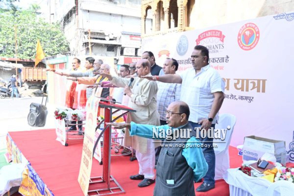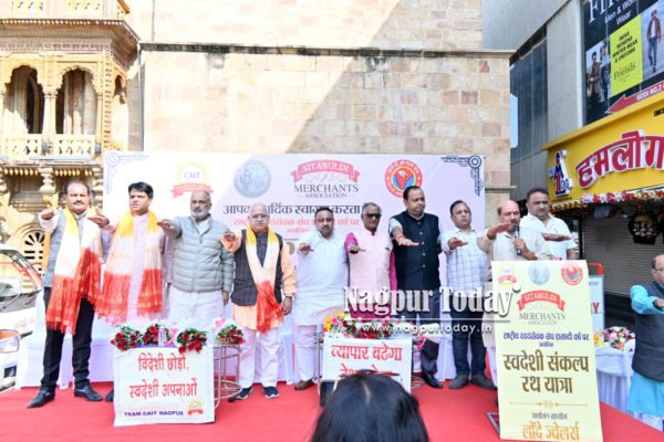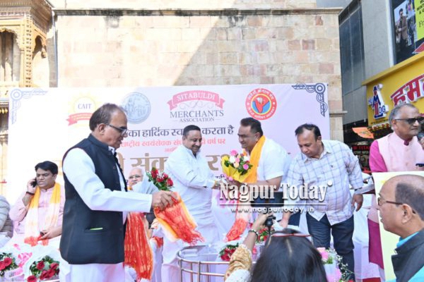 Nagpur: The Swadeshi Sankalp Rath Yatra received a grand and dignified welcome on Saturday as it arrived at Sitabuldi Main Road, where the Sitabuldi Merchants Association (SMA) showcased exemplary organisation and discipline — reaffirming its status as one of Nagpur’s most active and influential trade bodies.