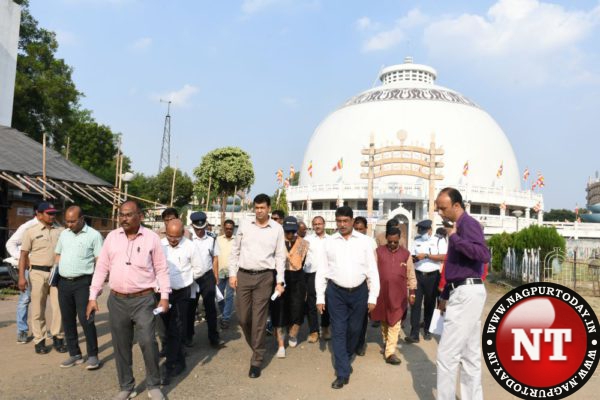 धम्मचक्र प्रवर्तन दिनासाठी नागपूर महानगरपालिकेद्वारे करण्यात येत असलेल्या व्यवस्थेचा आढावा घेण्यासाठी आयुक्तांनी बुधवारी (ता.११) दीक्षाभूमी येथे भेट दिली. यावेळी मनपाचे अधिकारी आणि डॉ. बाबासाहेब आंबेडकर स्मारक समितीचे पदाधिकारी यांच्यासमवेत आयुक्त तथा प्रशासक डॉ. अभिजीत चौधरी यांनी संपूर्ण परिसराची पाहणी केली.