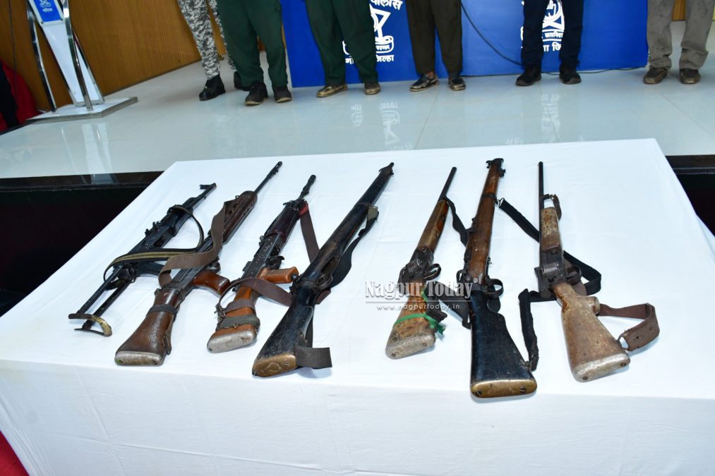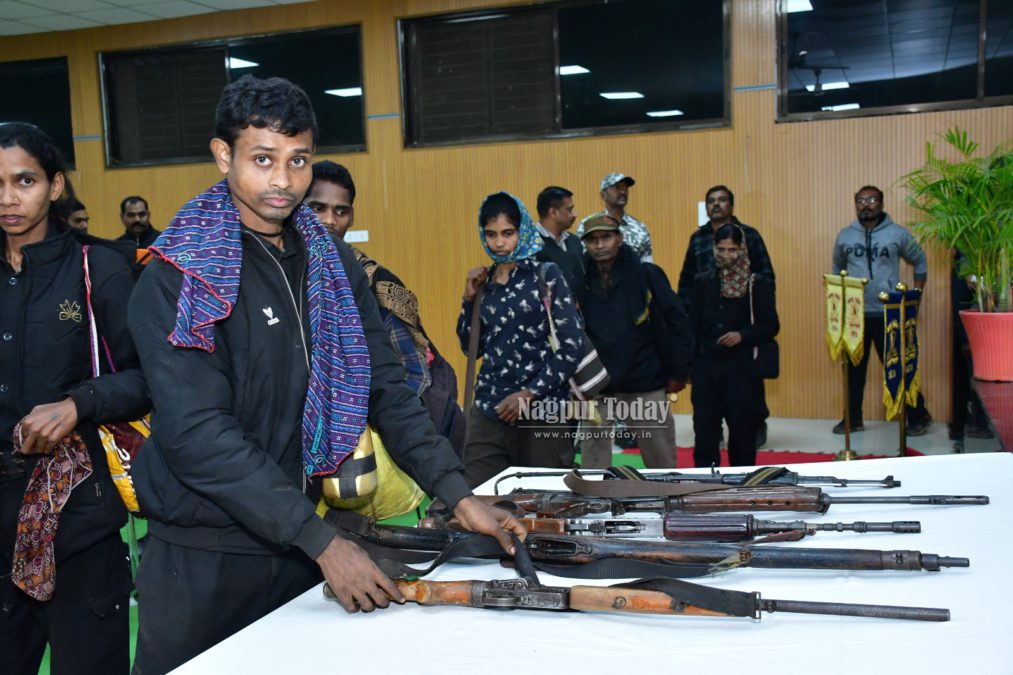 गोंदिया। महाराष्ट्र एमपी छत्तीसगढ़ स्पेशल ऑपरेशन यूनिट के सामने आज इतिहास लिखा गया ।गोंदिया पुलिस मुख्यालय में शुक्रवार 28 नवंबर रात 9:30 बजे 11 नक्सलियों ने गणवेश, हथियारों का ढेर , AK-47 गन और मैगजीन , SLR- इंसास राइफल , गोले और गोलियों के साथ डीआईजी अंकित गोयल तथा जिला पुलिस अधीक्षक गोरख भामरे के सामने सरेंडर कर दिया।