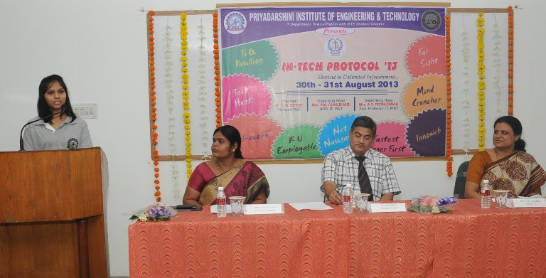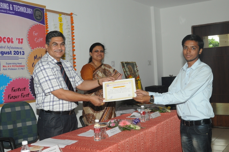 Dr. C. G. Dethe, Principal, PIET appreciated the student organizers for receiving enormous response for participation in different events of In-Tech Protocol ’13. He has also expressed his views on career opportunities in Information Technology and motivated the students during his address.