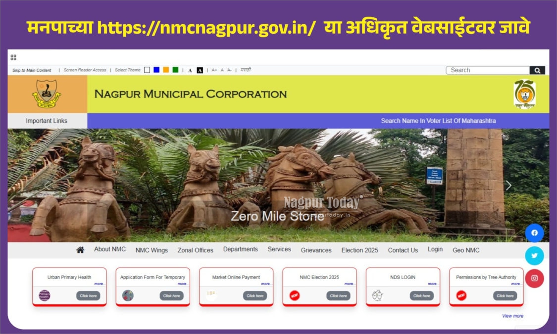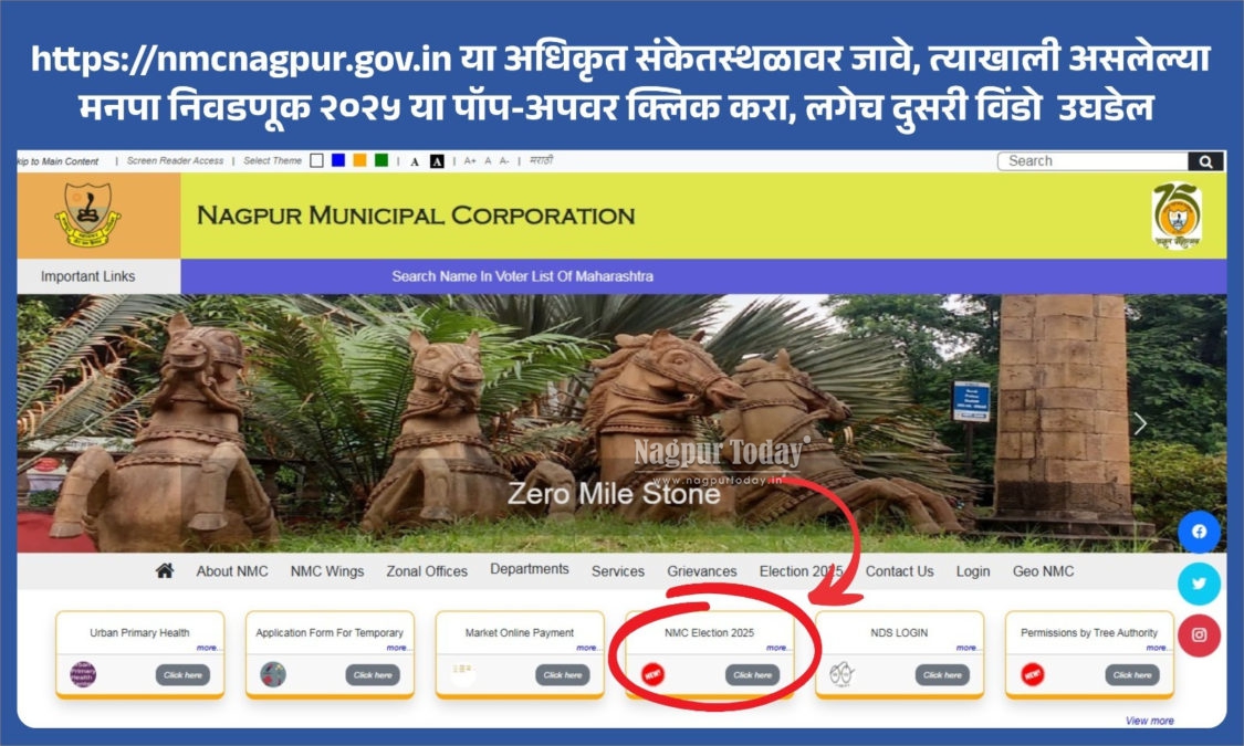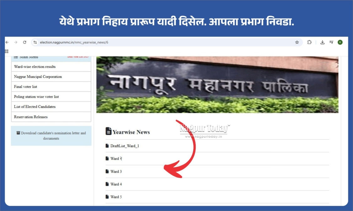 सर्वप्रथम https://nmcnagpur.gov.in या अधिकृत संकेतस्थळावर जावे, त्याखाली असलेल्या मनपा निवडणूक २०२५ या पॉप-अपवर क्लिक करा, लगेच दुसरी विंडो उघडेल. त्यावर असणाऱ्या ड्राफ वोटर लिस्ट २०२५ वर क्लिक करा. येथे प्रभाग निहाय प्रारूप यादी दिसेल.