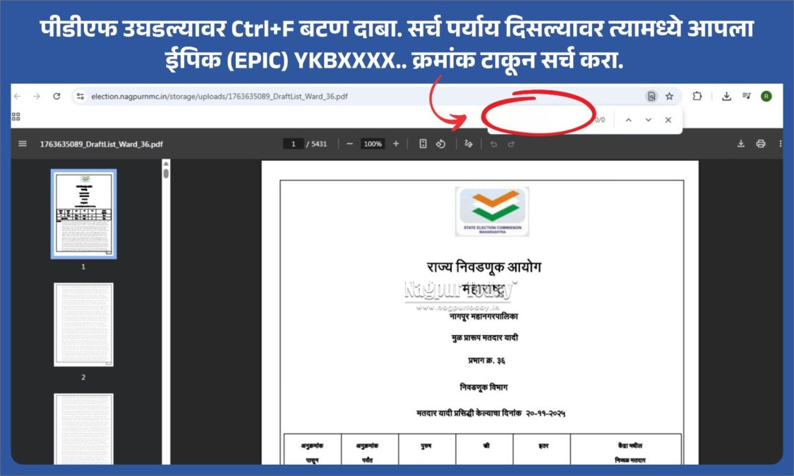 आपला प्रभाग निवडा. पीडीएफ उघडल्यावर Ctrl+F बटण दाबा. सर्च पर्याय दिसल्यावर त्यामध्ये आपला ईपिक (EPIC) YKBXXXX.. क्रमांक टाकून सर्च करा.