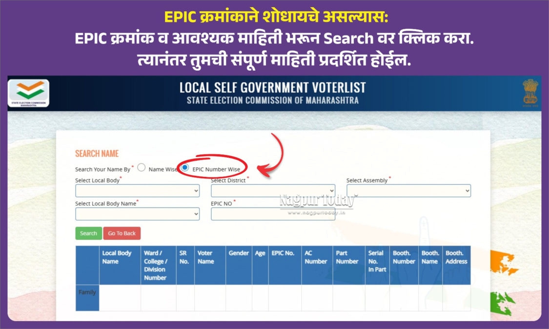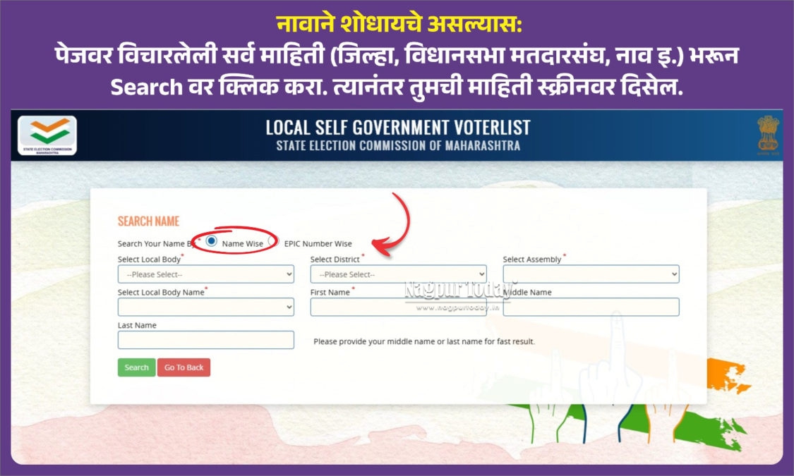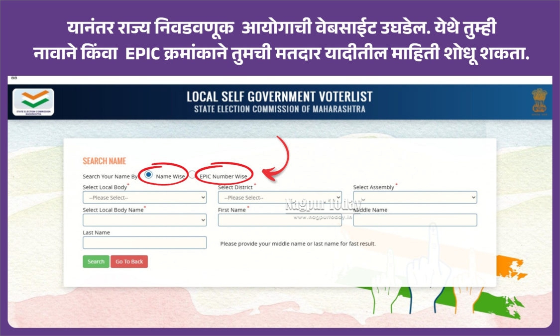 सर्वप्रथम https://mahasecvoterlist.in/ObjectionOnClick/SearchName या संकेतस्थळावर जावे. येथे जाण्याकरिता मनपाच्या https://nmcnagpur.gov.in या अधिकृत संकेतस्थळावर दिसणाऱ्या “Search Name In The Voter List Of Maharashtra” या पॉप-अपवर क्लिक करू शकता. लगेच दुसरी विंडो उघडेल त्यावर नाव आणि ईपिक (EPIC) क्रमांक असे दोन पर्याय दिसतील.
