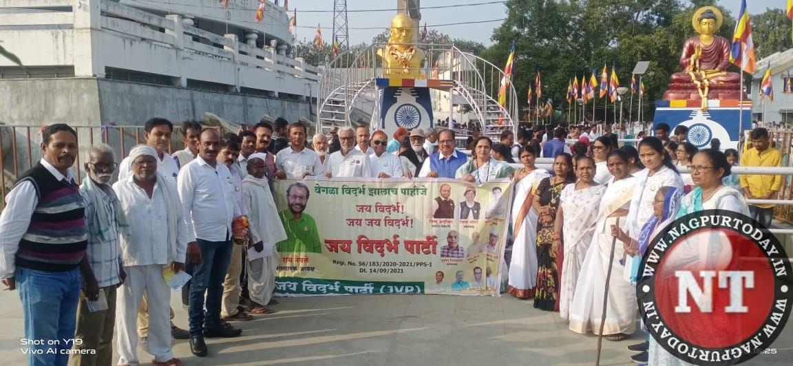 नागपुर: जय विदर्भ पार्टी के कार्यकर्ताओं ने मंगलवार को महापरिनिर्वाण दिवस के अवसर पर महामानव डॉ. बाबासाहेब आंबेडकर का अभिवादन किया। जय विदर्भ पार्टी की ओर से जनसंपर्क कार्यालय से कार्यकर्ता गण भारतीय संविधान के निर्माता डॉ. बाबासाहेब आंबेडकर के 66वें महापरिनिर्वाण दिवस पर श्रद्धांजलि देने हेतु दीक्षाभूमि की ओर प्रस्थान किए। डॉ. बाबासाहेब आंबेडकर ने 14 अक्टूबर 1948 को दार आयोग और 1955 में फ़ज़ल अली आयोग को एक दस्तावेज़ दिया था, जिसमें उन्होंने महाराष्ट्र के 4 राज्यों में विभाजन के विषय पर जोर दिया था।