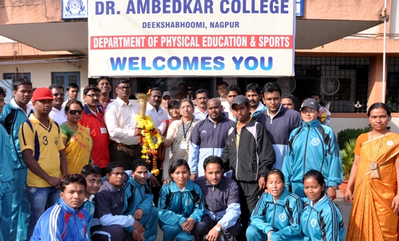 At around 3:00 pm, it was a moment of joy and enthusiasm for Dr. Ambedkar College Staff & Students at Deekshabhoomi when the “KRIDA JYOTI” entered in the college premises under the leadership of Principal Dr. Shyam Charde with well supported Dr. Sanjay Khalatkar, other staff members namely; Dr. Kohale, Dr. Borbandh, Prof. R. Pundalik, Prof. Mrs. Dhatrak, Principal Dr. Vivek Awasare, Dr. Sanjay Bhotmange.