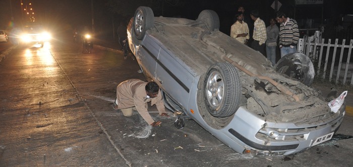 An over speeding vehicle driven in criss-cross manner has risked many lives of passers-by at Ajni square. However, luckily, no causalities were reported after the alleged drunk driver climbed his vehicle (MH31-CM6674) over the divider. Police sources said that the driver even slightly hit many vehicles on his way but none suffered any injuries. The four-wheeler overturned in a horrible manner fearing many eye-witnesses. But again, even the driver came out with minor injuries.