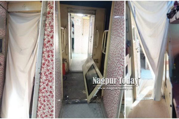 Pune/Nagpur: Passengers on Train No. 01202 Hadapsar-Nagpur Special were left outraged on Tuesday after discovering that the main door of the 3-Tier A/C coach (B1) was completely broken and kept aside, while a bedsheet was used as a makeshift cover in its place.