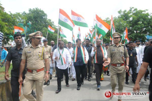 नागपूर : नागपूर महानगरपालिकेतर्फे स्वातंत्र्याच्या अमृत महोत्सवानिमित्त शनिवारी (ता. १३) सकाळी त्रिशताब्दी चौक ते त्रिशरण चौक पर्यंत तिरंगा पदयात्रा काढण्यात आली. केंद्रीय मंत्री श्री. नितीन गडकरी आणि महाराष्ट्राचे उपमुख्यमंत्री श्री. देवेंद्र फडणवीस यांच्या प्रमुख उपस्थितीत तिरंगा पदयात्रा काढण्यात आली. यावेळी आमदार सर्वश्री चंद्रशेखर बावनकुळे, प्रवीण दटके, मोहन मते, मनपा आयुक्त तथा प्रशासक श्री. राधाकृष्णन बी, माजी आमदार सर्वश्री गिरीश व्यास, डॉ मिलिंद माने, नाना शामकुळे, माजी महापौर श्री. दयाशंकर तिवारी, श्री. संदीप जोशी, नंदा जिचकार, अर्चना डेहनकर, माजी सत्ता पक्ष नेता श्री. अविनाश ठाकरे प्रामुख्याने उपस्थित होते. सर्वप्रथम मान्यवरांनी भारतरत्न संविधान निर्माता डॉ. बाबासाहेब आंबेडकर यांचा प्रतिमेला माल्यार्पण करून विनम्र अभिवादन केले. उपमुख्यमंत्री श्री. देवेन्द्र फडणवीस यांनी नागरिकांना स्वातंत्र्याच्या 75 व्या वर्षाची शुभेच्छा दिली. त्यांनी प्रत्येकाला या देश गौरवाच्या अभियानात सामिल होण्याचे आवाहन केले.