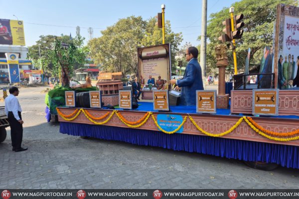 नागपूर : भारतीय संविधानाच्या अमृत महोत्सवानिमित्त समाजकल्याण विभाग नागपूर यांचेद्वारे तयार करण्यात आलेल्या भारतीय संविधानावर आधारित चित्ररथाच्या माध्यमातून नागपूर महानगरपालिकेद्वारे संपूर्ण शहरात जनजागृती अभियान राबविण्यात येत आहे. २६ जानेवारी रोजी प्रजासत्ताक दिनी पालकमंत्री चंद्रशेखर बावनकुळे यांनी हिरवा झेंडा दाखवून चित्ररथाचा शुभारंभ केला. मनपा आयुक्त तथा प्रशासक डॉ. अभिजीत चौधरी यांच्या मार्गदर्शनात व समाज कल्याण विभागाच्या सहायक आयुक्त श्रीमती सुकेशिनी तेलगोटे यांच्या नेतृत्तवात या चित्ररथाच्या माध्यमातून दहाही झोनमध्ये जनजागृती करण्यात येत आहे.