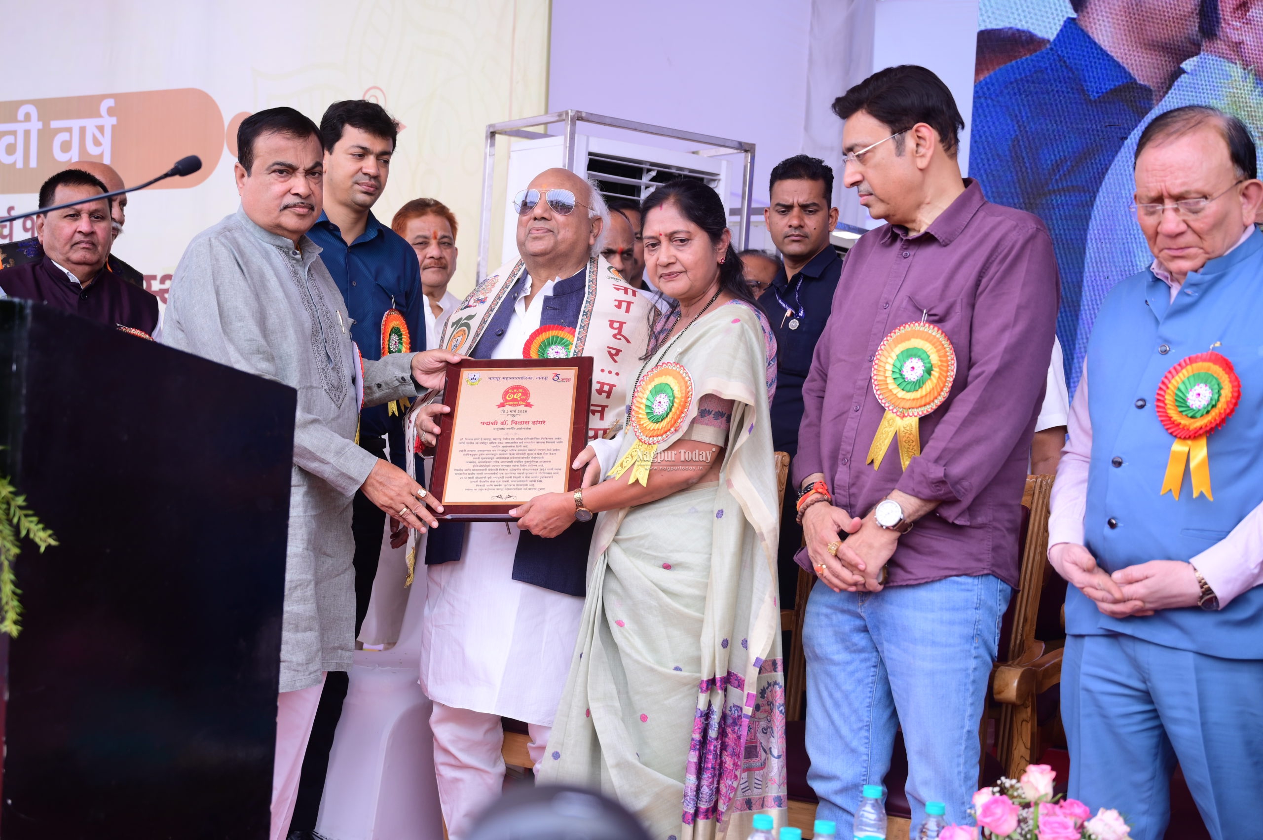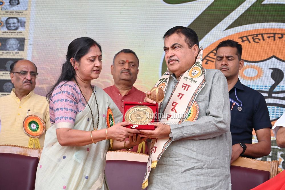 नागपूर महानगरपालिकेच्या अमृत महोत्सवी वर्षाच्या स्थापना दिनानिमित्त आज (ता. 2) मनपा मुख्यालयाच्या हिरवळीवर कार्यक्रम आयोजित केला होता. यावेळी केंद्रीय मंत्री श्री. नितीन गडकरी यांनी संबोधीत केले. अध्यक्षस्थानी महापौर श्रीमती निता ठाकरे होत्या. या कार्यक्रमात सर्व माजी महापौर व उपमहापौर तसेच दिवंगत महापौर व उपमहापौरांच्या कुटुंबियांचा मनपाचा मानाचा दुपट्टा, गौरव चिन्ह, श्रीफळ व तुळशीचे रोपटे देऊन सत्कार करण्यात आला. यावेळी पद्मश्री पुरस्कार प्राप्त डॉ. विलास डांगरे यांचा सुद्धा सत्कार केंद्रीय मंत्री श्री. नितीन गडकरी व महापौर यांच्या हस्ते मानाचा दुपट्टा, सन्मान चिन्ह, श्रीफळ व तुळशीचे रोपटे करण्यात आला.