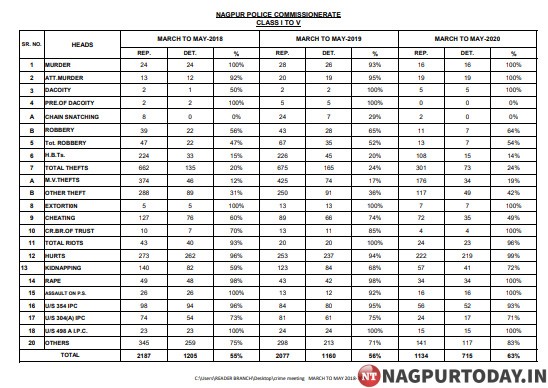 नागपुर पुलिस के प्रेस नोट के अनुसार 2020 में मर्डर, मर्डर की कोशिश,डकैती,चैन स्नैचिंग,रॉबरी,खंडनी,धोखाधड़ी, अपहरण,रेप के कुल मामले 1134 में से 715 मामलों में डिटेक्शन किया गया है. जो पिछले दो सालों से बेहतर है.