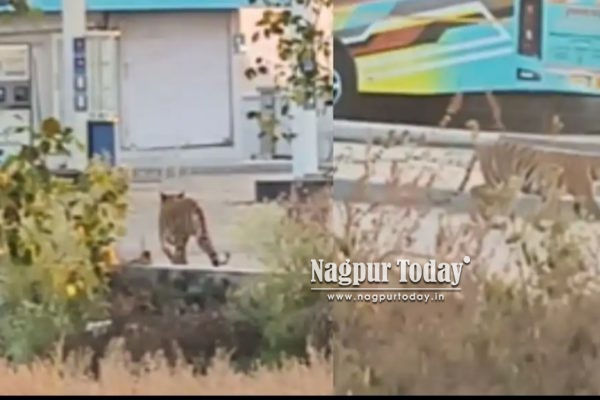नागपूर : जिल्ह्यातील कुही तालुक्यातील मांढळ परिसरात आज पहाटेच्या सुमारास पेट्रोल पंपाजवळ वाघ दिसल्याने एकच खळबळ उडाली. मांढळ–पचखेडी मार्गावरील नायरा पेट्रोल पंपाच्या परिसरात रस्त्यावरून निर्धास्तपणे फिरताना हा वाघ काही नागरिकांच्या नजरेस पडला.