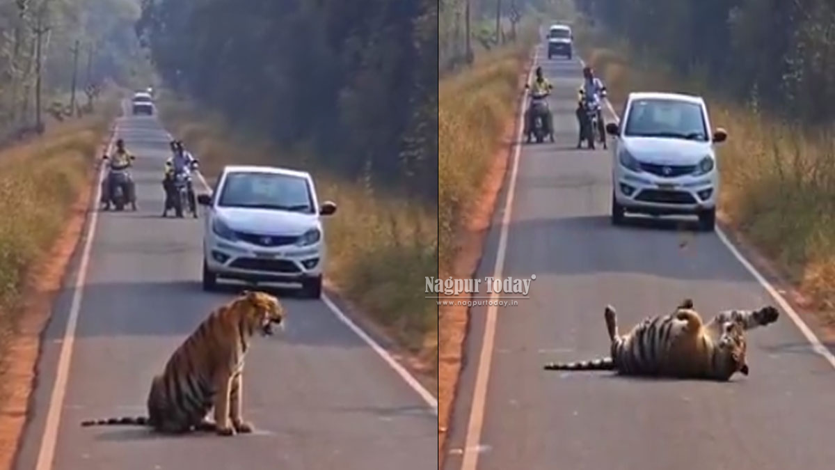 दोन दिवसांपूर्वीही एक प्रौढ वाघ या रस्त्यावर येऊन वाहनांचा मार्ग रोखून बसला होता. तो जांभया देत, लोळत बसल्याने दोन्ही बाजूंना गाड्यांची मोठी रांग लागली होती. वनविभागाने पुन्हा एकदा सर्वांना नियम पाळण्याचे आवाहन केले असून, उल्लंघन करणाऱ्यांवर कडक कारवाई केली जाणार असल्याचे संकेत दिले आहेत.