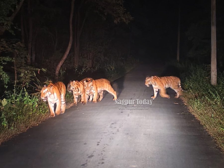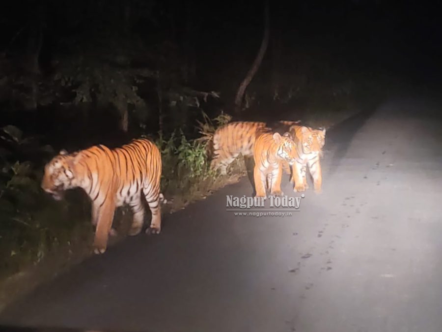 पवनी- खापरी सड़क पर टहलती दिखी एक खूंखार बाघिन और उसके तीन नन्हें शावक , मानों जंगल की महारानी अपने बच्चों संग ” नाइट पेट्रोलिंग ” पर निकली हो।