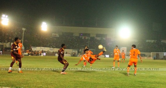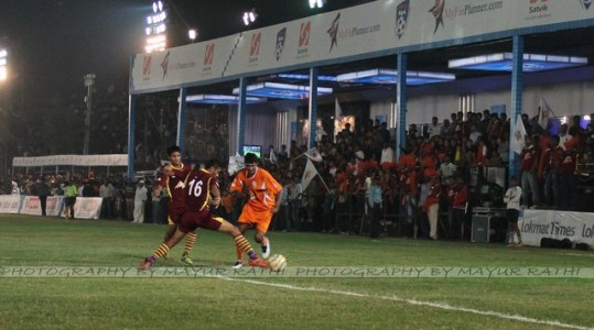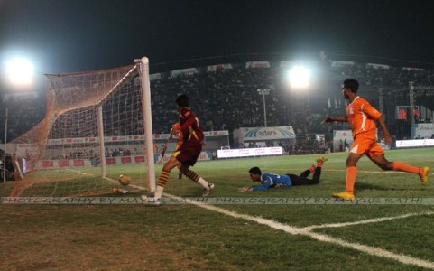 Sunil hi-tech player scoring the goal which landed on the side netting instead of inside the goal.